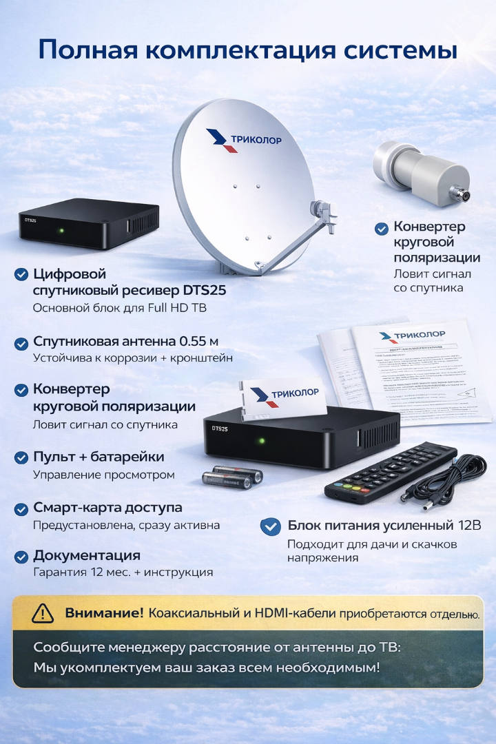 Ищете надежный способ смотреть любимые телеканалы на даче или в загородном доме, где нет стабильного интернета? Представляем эксклюзивное решение для жителей Беларуси — готовый комплект Триколор DTS25 с предоплаченным пакетом каналов на 10 лет!