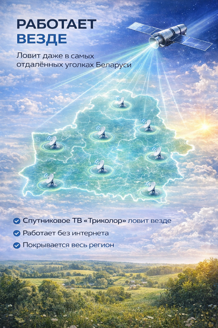 • Идеально для любой глубинки: Спутниковая антенна диаметром 0.55 м обеспечивает стабильный сигнал Full HD качества в любой точке РБ — от Минского района до самых отдаленных деревень Витебской или Брестской областей.
