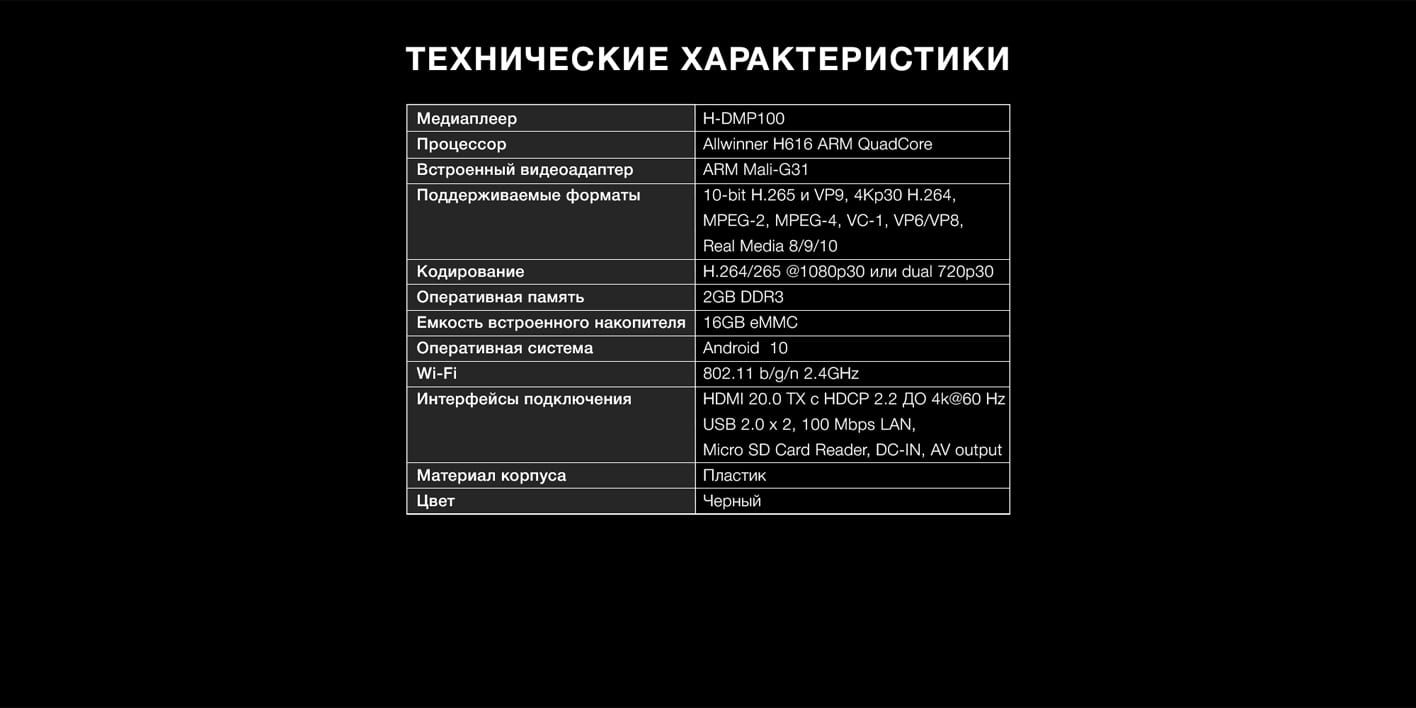 Портативный мультимедиа-проигрыватель работает на базе Android 10. Системный софт позволяет устанавливать множество совместимых программ, открывать и воспроизводить файлы практически любого формата. Встроенные контроллеры Wi-Fi и Ethernet помогают выходить в глобальную сеть. Видеоматериалы, находящиеся на локальных носителях (например, на картах памяти microSD), воспроизводятся даже с разрешением 3840 x 2160 пикселей (4K UltraHD). Сюжеты, скачиваемые с YouTube, могут демонстрироваться в FullHD. Высокопроизводительный четырехъядерный процессор Allwinner H616 ARM выполняет все операции быстро. Наличие двух разъемов USB позволяет задействовать компьютерную клавиатуру и мышь. В комплект входят HDMI-кабель, блок электропитания, пульт ДУ.