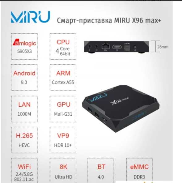 -Операционная система Adroid 9.0 - Процессор: Amlogic S905X3 Quad Core ARM Cortex A55